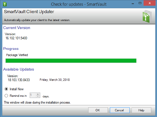 - If your version of SmartVault is out-of-date, the updater will automatically download the necessary update. Click OK to install it, then follow the instructions provided by the installation wizard.